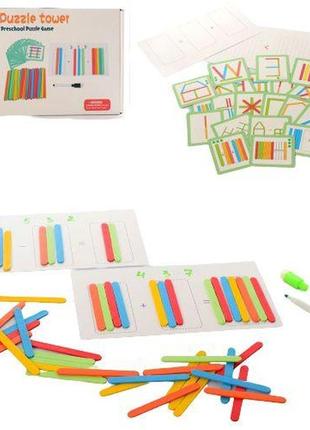 Розвиваюча дерев'яна гра включає: рахункові палички, 25 карток із завданнями, маркер, 2 картки для прикладів. Рахункові палички виготовлені з дерева. Набір допоможе малюкові у вивченні кольорів, цифр та прикладів. Розвиває логічне мислення та дрібну моторику. Набір для дітей від 3 років.