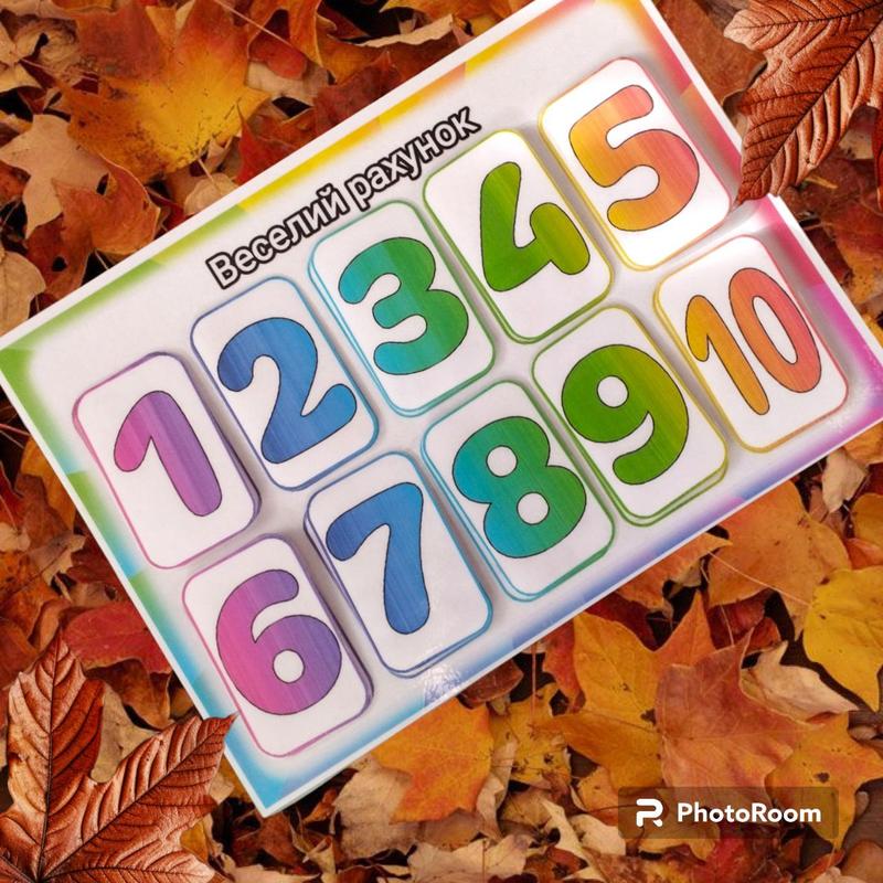 Гра на липучках "Веселий рахунок" Дитині потрібно порахувати кількість картинок та наклеїти відповідну цифру. Гра складається з аркуша А4 та 10 деталей на липучках.