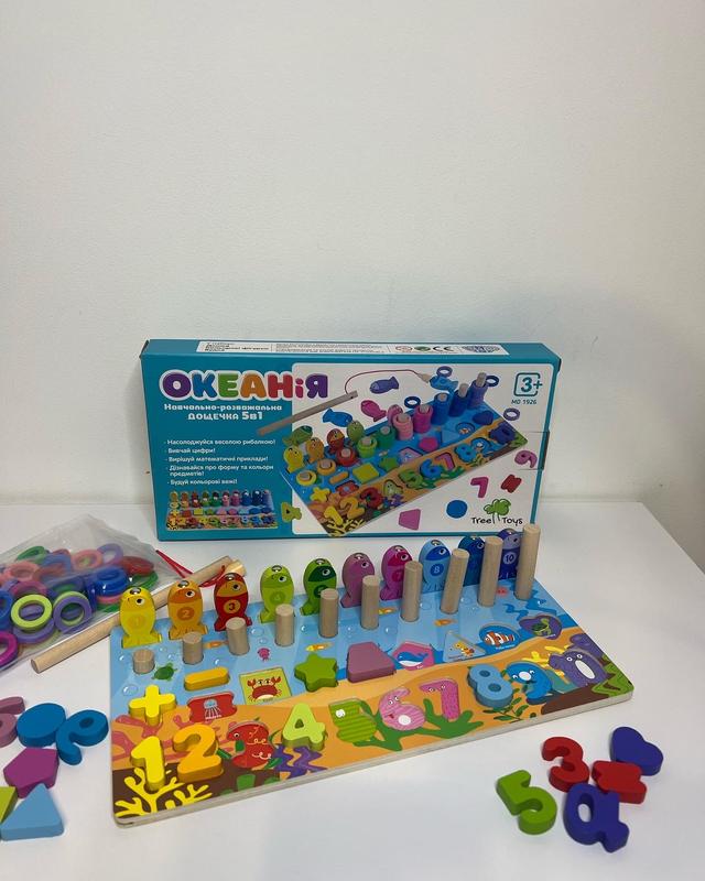 Наждально-развлекательная Дощечка 5в1 • Наслаждайся веселой рыбалкой! • Вивчай цифри! • Решай математические примеры! • Узнай про форму и цвета предметов! • Строй цветные башни! • Рыбалка • Математика • Колористика • Восприятие форм • Арифметические кольца Размер 30,5х16х4 см