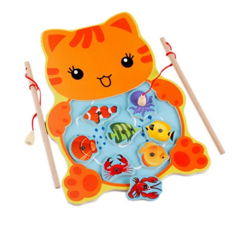 деревʼяна рибалка у вигляді тварини, дошка розміром 29*22см, в комплекті 2 магнітних вудки та 8 фігурок.