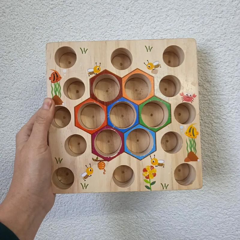дерев'яна дошка з отворами для розміщення бджіл та зображення сот, кольори яких відповідають кольорам бджіл.