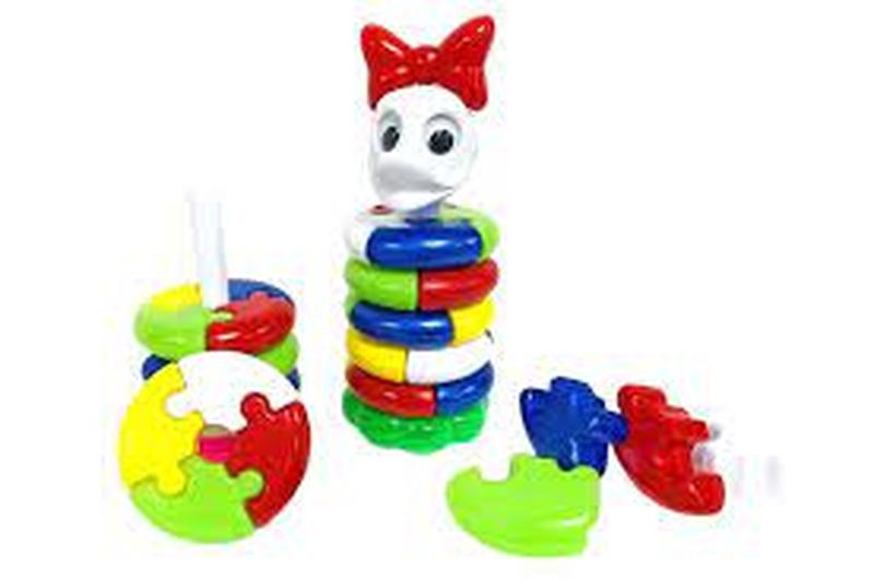 Пирамидка "Пазл" состоит из: основы - 1 шт, кольца-пазлы - 5 шт, верхушка-голова - 1 шт. Размер пирамиды - 30*15 см. Вес - 250 г.