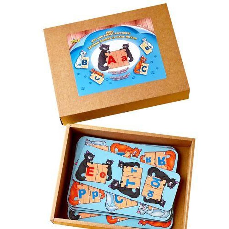 Деревʼяний ігровий набір, який допоможе малюкові навчитися розрізняти великі та маленькі літери. У комплекті є міні-пазли із літерами українського алфавіту, прикрашені чарівними котиками. Загалом у наборі 66 елементів. Виконано з якісних та екологічно-чистих матеріалів. Для дітей віком від 3-х років.