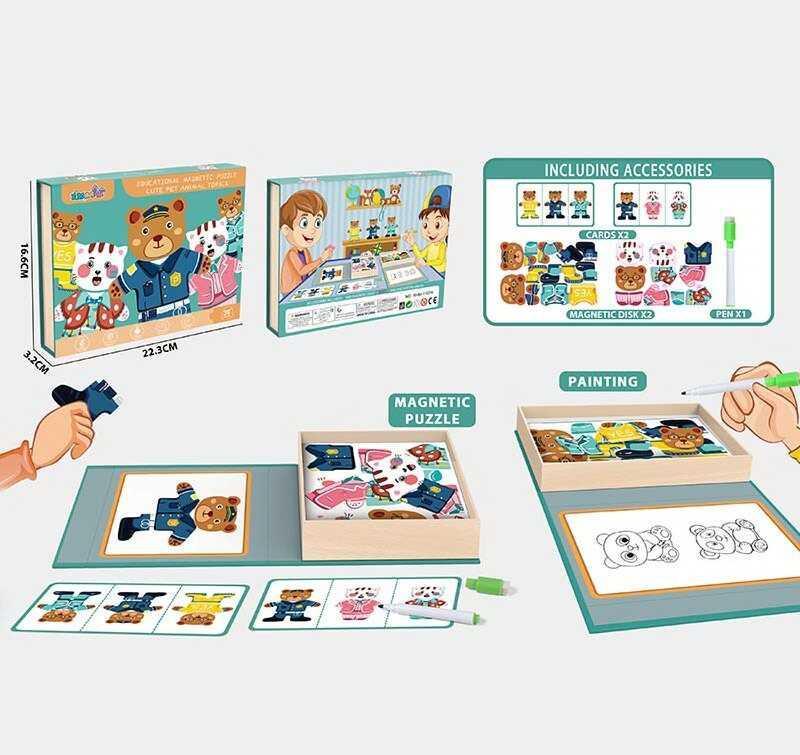 С такой магнитной игрой можно сложить цветные пазлы и узнать, кто скрылся за этими элементами. Она не только функциональна, но и хранится в удобной коробочке, которую можно вскрыть и сделать из своего стола игровое магнитное поле. Поэтому будет легко складывать пазлы даже в дороге, ведь игра не займет много места, а если захочется добавить что-то свое, можно взять фломастеры, которые добавляются в комплект и легко стираются, и добавить немного креатива. Поэтому раскрывай эту веселую игру и попробуй сочинить яркие картинки. Особенности: - в наборе 28 элементов; - магнитная игра состоит из пазлов; - с помощью пазлов можно составить несколько изображений животных, которые решили выбрать разные профессии; - игра хранится в коробке, которая при раскрытии превращается в удобное игровое магнитное поле; - в набор добавляется цветной фломастер, с помощью которого можно украсить карточки рисунками, а по желанию легко его стереть; - набор изготовлен из качественных материалов. Внимание. Производитель оставляет за собой право изменять комплектацию, цветовую гамму и характеристики товара без предварительного уведомления. После оформления заказа мы свяжемся с Вами в течение 2-х часов и если у Вас возникнут вопросы, мы с радостью на них ответим.