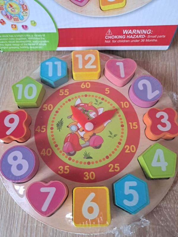 Дерев'яна гра "Годинник" передбачена для діток від 3 років. За допомогою даної гри дитина почне розбиратися в годинах, навчиться основам рахунку, а також буде тренувати дрібну моторику рук, просторове і логічне мислення. Іграшка виконана у вигляді справжнього годинника. У якості цифр, виступають різнокольорові геометричні фігури. Дві рухомі стрілки, а також зображення хвилин, допоможуть дитині розібратися в поняттях «година» і «хвилина». 12 кольорових фігур і відповідні отвори для них, по периметру годинника, дозволять дитині використовувати гру, як сортер. Універсальна гра "Годинник" абсолютно безпечна для дитини, тому, що її елементи виконані з якісної деревини й пофарбовані нетоксичною фарбою. розмір 19см