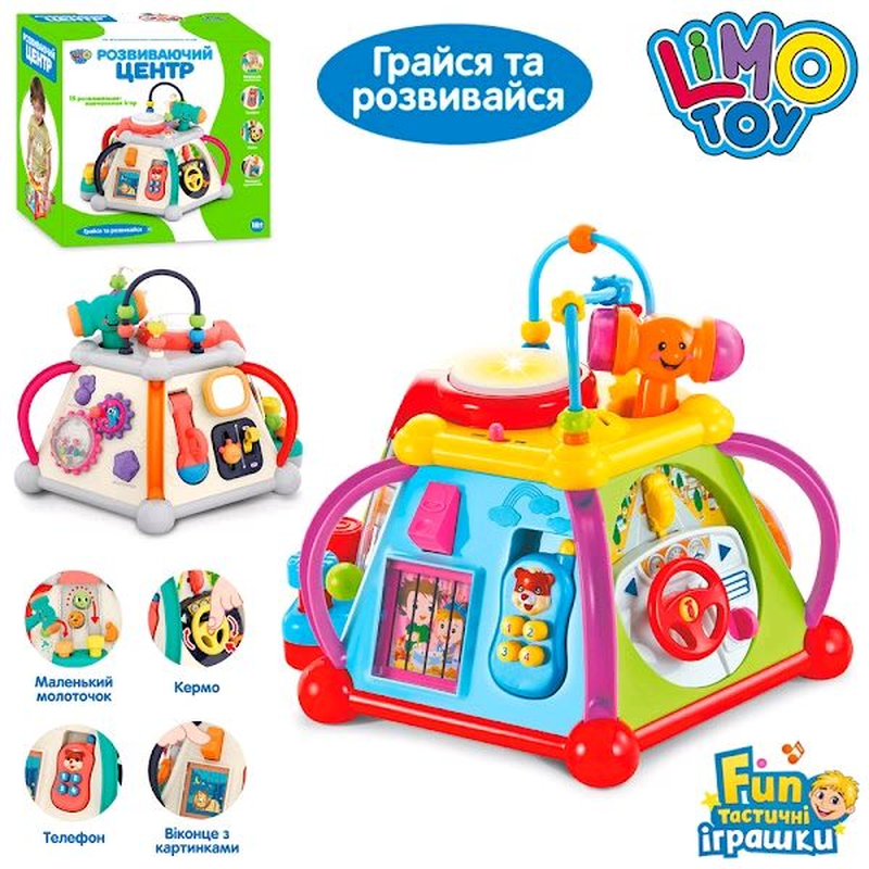 Тип іграшки: Центри Додаткова інформація куб, логіка, муз., світло, бат., кор., 30-28-18 см Багатофункціональний музичний ігровий Мультібокс є 5-сторонню піраміду і включає 15 унікальних ігор. Дитячий знімний стільниковий телефон - пищалка і віконце з дзвінком. При натисканні на дзвінок у віконці змінюється картинка, що супроводжується звуками, відповідними образу картинки. Панель машини, що складається з ключа запалювання, керма з сигналом і іграшкової машинкою, керованої кермом (сигнальна кнопка на кермі і ключ запалювання при натисканні видають відповідні звуки). Два коліщатка, з'єднані зубчастої передачею, при обертанні яких лунає мелодія. Для вибору мелодії використовується кнопка над коліщатками, для зупинки мелодії - кнопка під коліщатками. Караоке з цим мікрофоном, дзеркальцем-телевізором і тріскачкою (дзеркальце перетворюється в телевізор підняттям вимикача знизу). Стучалка з молотком, підкидає кульку в прозорій трубці, і дві стучалки на гумках. У верхній частині Мультібокса розташована прозора кнопка-барабан, миготлива при натисканні і видає забавні звуки, і рахунки-лабіринт з різнокольоровими намистинами. Ігровий Мультібокс розвиває моторику, візуальні, слухові, сенсорні, пізнавальні навички дитини, сприяє розвитку мови