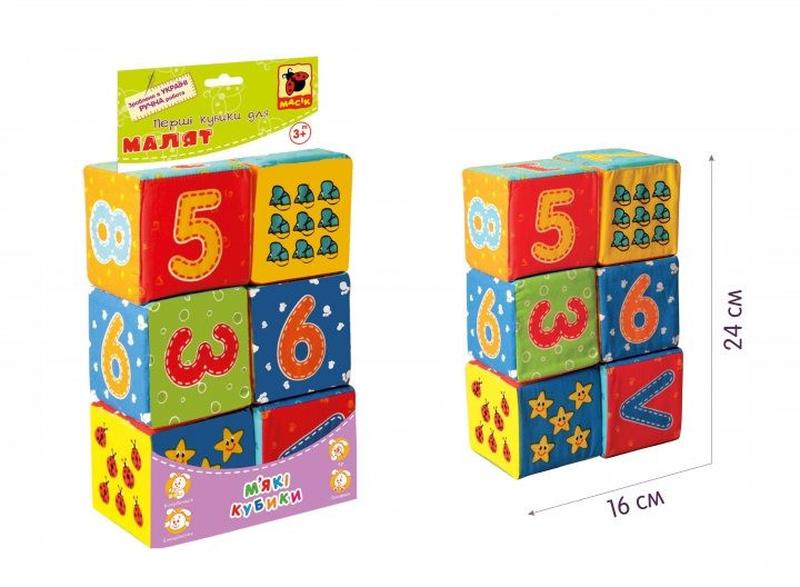 Яркий мир цифр! Мягкие кубики с изображениями цифр, математических символов и предметов помогут сделать первые шаги к познанию математики. В наборе шесть разноцветных кубиков, на каждом из которых изображено число, а также количество предметов, которое оно обозначает. Игрушка – легкая и мягкая на ощупь. Ребенок может смело грызть, кидать, мять кубики, что так нравится делать детям в этом возрасте. Манипуляции с мягкими предметами отлично тренируют координацию движений. Красочные рисунки развивают глазомер, цветовосприятие. Игрушка изготовлена из качественных безопасных для самых маленьких деток материалов. Первые кубики помогут заложить основы гармоничного развития вашего ребенка, а впереди еще множество маленьких и больших открытий. Мир малыша складывается из множества вещей. То, чем окружен ребенок, формирует его чувства, мышление, восприятие. Окружите ваше чадо теплотой и заботой, а также полезными развивающими игрушками. В наборе 6 кубиков. Размер одного кубика: 8 х 8 х 8 см. Состав: х/б ткань; швейная фурнитура; поролон. Размер: 16,5х24х8 см. Размер в упаковке: 16,5х33х8 см.