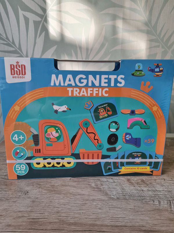 Тип іграшки: Інший тип іграшки Магнітна дошка – іграшка функціональна і цікава. Вона легко встановлюється на будь-яку рівну поверхню. А завдяки компактним розмірам і зручній формі у вигляді валізки, дитина з легкістю може взяти гру з собою в поїздку. В специальном выдвижном картонном чемоданчике находятся разноцветные детали различных форм и размеров. Из них ребенок сможет составлять виды трансорта. В комплект входят карточки, на которых представлено много интересных примеров. Вначале, ребенок может использовать их в качестве подсказок, пока у него не возникнет желание сделать что-то самостоятельно. Все элементы комплекта крупные и крепкие, с гладкими округлыми краями, о которые невозможно пораниться. В набор входит: - 59 игровых элементов; - 10 карточек с примерами; - чемоданчик с планшетом.