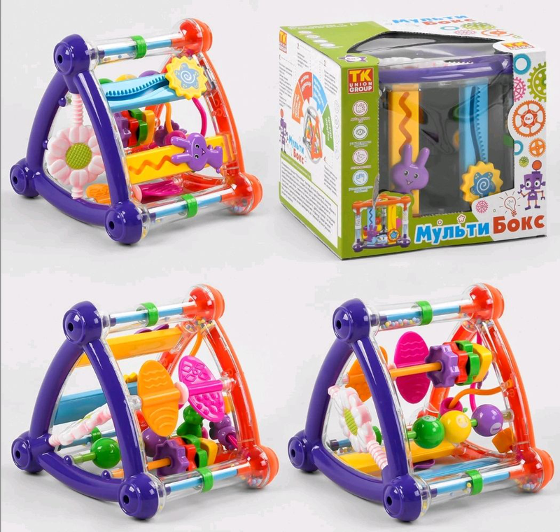 Тип іграшки: Інший тип іграшки Ігрова модель являє собою інтерактивний трикутник, що володіє широкими функціональними можливостями, де кожна сторона оснащена захоплюючими іграми. Мультибокс виготовлений з первинної пластмаси, пофарбований високоякісними фарбами та доповнено прозорими трубками в яких знаходяться маленькі різнокольорові кульки. По всій поверхні іграшки, пластик, створює приємні відблиски, що свідчить про якість і насиченості ігрової конструкції. Ігрові грані: 1. Обертові листочки з різною фактурною поверхнею. 2. Фигурный пальчиковый лабиринт с цветными бусинами и веселыми пчелками. 3. Счеты с 3-мя разноцветными шариками и геометрическими фигурками. 4. Вращающееся безопасное зеркальце в виде красивого цветочка. 5. Два тренажера для разработки запястий. В процессе увлекательной игры с интерактивным треугольником, кроха будет развивать координацию движений, тактильное, звуковое и слуховое восприятие, мелкую моторику ручек, а также потренирует память и внимательность.