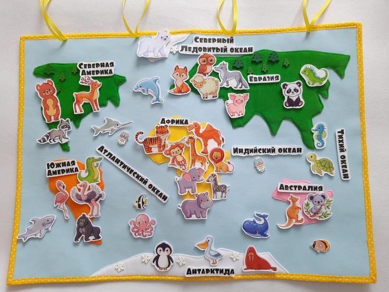 Карта мира из фетра на стену в детскую комнату. животные из фетра на липучке. материки, ок...