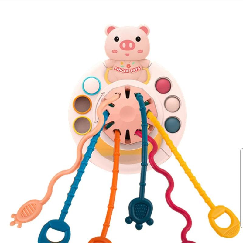 Погремушка-прорезыватель для стимуляции двигательной активности, содействие развитию координации, а также сенсорного и слухового восприятия. Также подходит для использования при прорезывании зубов. Игрушка имеет гибкие и эластичные силиконовые трубки для развития мелкой моторики, хватательного рефлекса и тактильного восприятия. Текстурированные трубки можно тянуть из стороны в сторону, а концы использовать как грызунки. Боковая часть игрушки оснащена тремя мягкими кнопками "pop it" и одной твердой. На верхушке размещена игрушка в виде свинки в которой размещены шарики, которые создают звук погремушки.