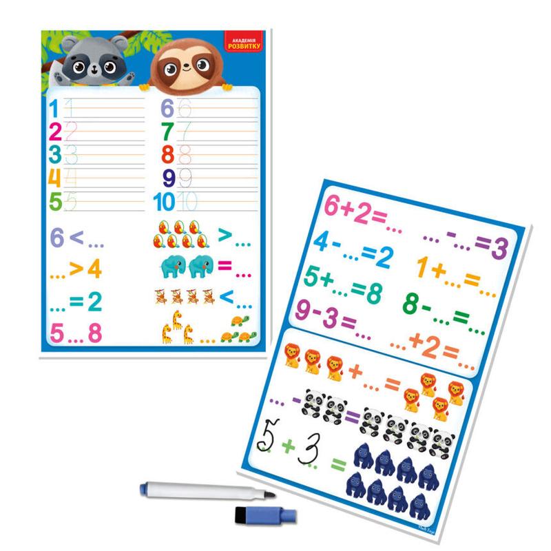 Учите математику вместе с яркой доской-тренажером!Набор содержит двустороннюю доску и многоразовый маркер. С одной стороны показаны цифры и неравенства, а с другой – простые примеры. Ребенок может сначала обвести цифры по контурам, а затем перейти к решению примеров. Можно совсем не бояться ошибок. Ведь маркер легко вытирается с поверхности доски с помощью специальной губки. К пройденному материалу можно возвращаться множество раз. Игра тренирует логическое мышление, память и мелкую моторику. Комплектация: двухсторонняя доска, маркер «Пиши-вытирай».