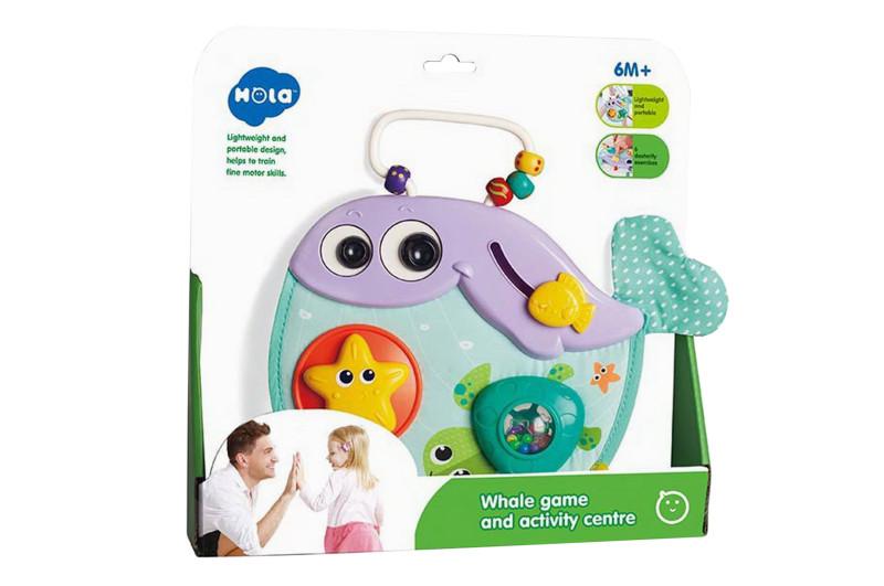Развивающий центр Hola (Холла) скрывает множество сюрпризов, которые надолго заинтересуют малыша и непременно обеспечат правильное развитие с первых месяцев жизни. Выполненная погремушка в форме забавного кита. Тело кита оснащено множеством игровых элементов: вращающаяся морская звездочка с трещоткой; прозрачный вращающийся мячик с разноцветными шариками; тренажер для развития запястья в виде яркой рыбки с трещоткой; вращающие глаза разного диаметра; фигурная ручка для переноски с пестрыми бусинами; хвостик с шелестящим элементом; 2 ленты, изготовленные из разных материалов.