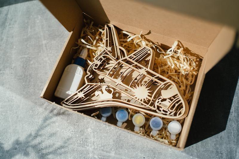 Дерев'яна 3д розмальовка У творчий набір входять: дерев'яні деталі (5 шарів); кісточка і акрилові фарби; клей ПВА; кріплення; інструкція. Додатково ви можете придбати круглий панно 30 см. Кольори панно: чорний / білий, сірий /та не фарбоване.