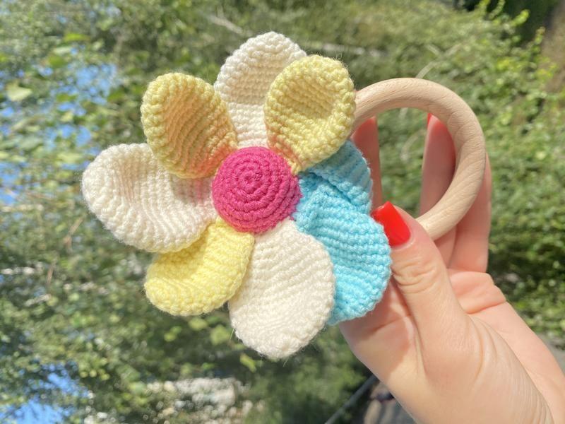 Мягкий цветочек погремушка и шуршалка. Выполнена из безопасных и гипоалергенных материалов. Подарок для девочки. Дополнительные характеристики: Пол: Для девочек Возраст : До 2 лет Материал : Дерево Материал : Пряжа Вид : Погремушки