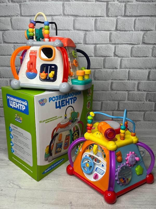 Мультибокс 5-сторонней формы, на каждой стороне которой ваш малыш найдет множество различных интересных игр с музыкальным сопровождением и необычными звуками. На первой стороне игрушки панель автомобиля. В центре есть вращающийся руль с кнопочкой сигнала, а также ключ зажигания машины, имеющий соответствующий звук. Выше на картинке с улице расположена маленькая машинка, которая двигается вправо и влево, при поворачке руля. На второй стороне игрушки предназначена для тренировок, чем так любят заниматься все малыши. Две кнопочки и изогнутая трубочка, в которой находится шарик. При нажатии на кнопочки, слышен соответствующий звук, а шарик по трубке может перескакивать от одной кнопки к другой. За кнопочками можно также бить молоточком, что расположено сверху игрушки На третьей стороне мультибокса расположен микрофон, который может выдвигаться и обратно складываться. Также есть зеркало, нажимая соответствующий рычаг, оно превращается в телевизор. Ещё на этой стороне есть переключатель в виде солнышка, который заинтересует ребенка своим треском. Четвертая сторона игрушки музыкальная, она включает примерно десять различных мелодий. По центру расположены два колесика, которые ребенок может вращать благодаря зубчатому механизму, при этом играет мелодия и мигает свет. Нажимая на кнопочку-нитку мелодия повторяется. Чтобы изменить мелодию, необходимо переключить ее с помощью кнопочки-звездочки. Сверху на мультибоксе расположена главная кнопка включения/выключения ON/OFF, большая игровая кнопка, при нажатии она мигает и издает забавные звуки. Также есть место отверстия для хранения молоточка и счеты-лабиринт. Игрушка выполнена из качественного и нетоксичного материала, использованы яркие цвета, которые захватывают малышей. Кроме этого, игрушка развивает визуальные и слуховые навыки, моторику, логическое мышление. Размер игрушки: 28 Х 18 см Размер упаковки: 30 Х 29 х 18 см