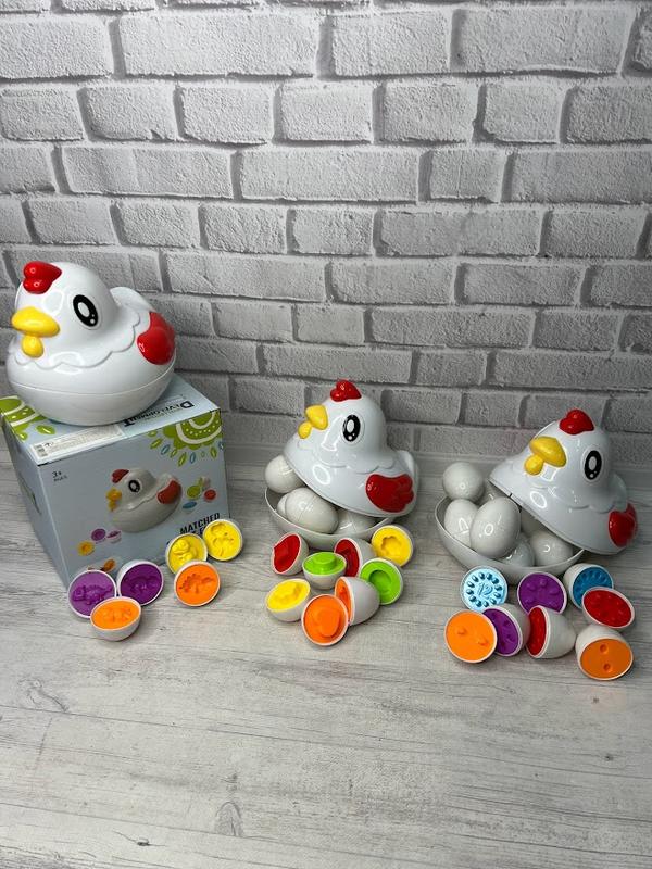 Игрушка поможет развить у любознательного малыша ловкость рук, мелкую моторику, а также научат его комбинировать предметы по цветам и формам! Особенности: - современный дизайн; - гармоничное сочетание цветов; - внутри каждого яйца спрятано 3D изображение; - сердцевинки окрашены в яркие уникальные цвета; - компактная коробочка в виде курочки 16см; - все предметы в игре выполнены из безопасного гипоаллергенного пластика.