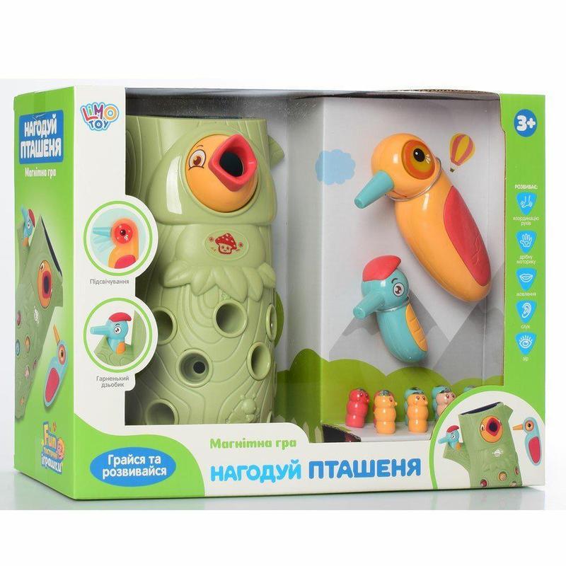 Опис Гра магнітна TK Group Нагодуй пташок 9 черв'ячків/пташки з магнітним кльовиком/1 пташка зі світловими та звуковими ефектами Захоплююча дитяча магнітна гра "Нагодуй пташок" від відомого виробника "TK Union Group" представлена в стильному та сучасному дизайні, який поєднує в собі ніжну палітру пастельних кольорів і приємні на дотик деталі. Дерево в якому сидить пташка забарвлене в приємний салатовий колір, кора з абстрактними закрученими лініями розстелилася по всій основі та доповнює оригінальний зовнішній вигляд. У стовбурі масивного дерева живуть 9 довгих черв'ячків. Їх тіло поділено на сегменти та пофарбовано в пастельний однотонний колір, а на голові розташувався магнітик та круглі очі. Турботливій мамі - пташці необхідно витягнути черв'ячка за допомогою спеціального магнітика на дзьобі та нагодувати свого голодного малюка. У неї рухливий дзьобик, який опускається і підіймається, при цьому відтворюється спів птахів, а також кнопка на крильці, яка активує: - підсвічування очей; - веселу мелодію. Маленький дятел в комплекті, також обладнаний магнітним клювиком, у нього приємна обтічна форма і гумовий чубчик. З даними розвиваючим набором дитина розвине координацію рухів, дрібну моторику ручок потренується уважність і посидючість. Всі ігрові елементи виконані з первинного пластику і пофарбована високоякісними фарбами, які абсолютно безпечні для малюків. Комплектація: - стовбур дерева; - 2 пташки; - 9 черв'ячків. Звукові та світлові ефекти пташки працюють від батарейок які входять в комплект.