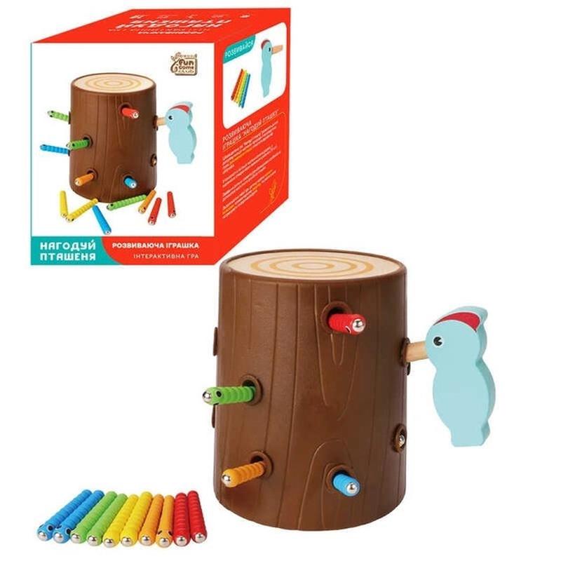 Магнітна гра "Нагодуй пташеня". Гра представлена стовбуром дерева, пташкою та 15 хробачками. Вікова категорія - 18+ місяців. Виконана у поєднанні деревини та пластику. Хробачки і дзьоб пташки оснащені магнітами. Гра допомагає познайомитися з кольорами, навчить рахувати від 1 до 15, тренуватиме дрібну моторику та координацію рухів.