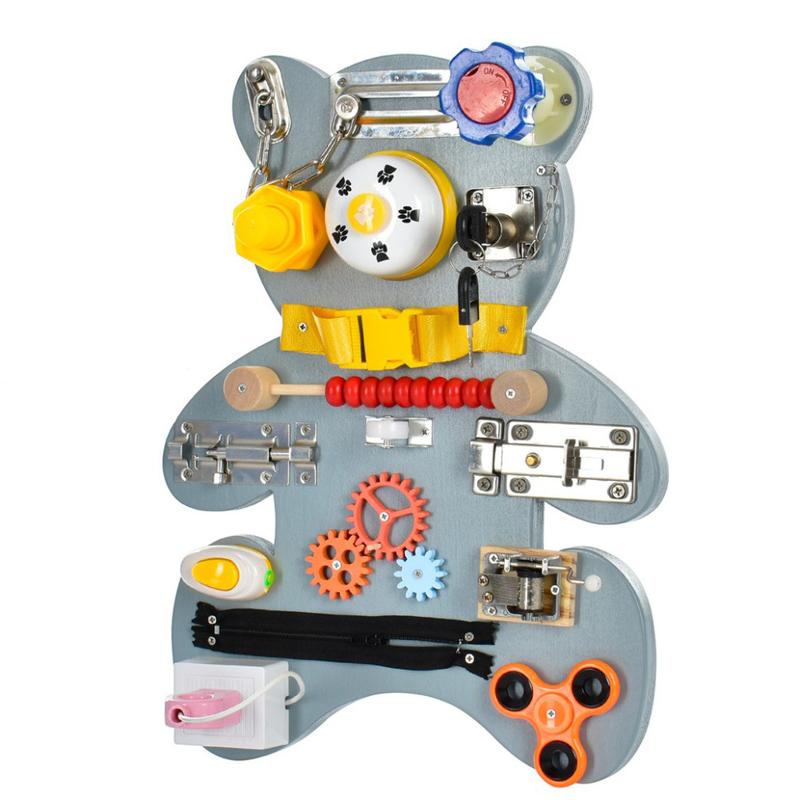Бізіборд - це неймовірно функціональна і корисна дитяча іграшка, яка складається з різноманітних елементів, що включають в себе перемикачі, замочки, кнопки, обертові та рухомі деталі, важелі та інші механізми. Головна ідея бізіборда полягає в тому, щоб діти мали можливість вивчати, експериментувати та розвивати свої навички, використовуючи різні рухомі елементи. Розвиток моторики: Дитина може маніпулювання різними елементами бізіборда, що сприяє розвитку моторики та координації рухів. Розвиток мислення: Іграшковий бізіборд стимулює креативне мислення та проблемне вирішення завдань. Розвиток когнітивних навичок: Виконуючи завдання на бізіборді, діти вчаться концепціям розміщення, порівняння, класифікації та інших когнітивних навичок. Розвиток терпіння та концентрації: Деякі елементи бізіборда можуть вимагати часу та наполегливості для їх вирішення, що сприяє розвитку терпіння та концентрації у дітей. Особливості: - розмір: 28х4х40 см; - бізіборд має форму ведмедика; - основа виготовлена з дерева, а ігрові елементи з пластику та металу; - серед основних ігрових елементів є: різні види замочків, обертові шестерні, спінер, вилка з розеткою, блискавка, рахівниця, дзвіночок, болтик з гайкою, вимикач. Розмір упаковки: 30 см × 8 см × 41 см