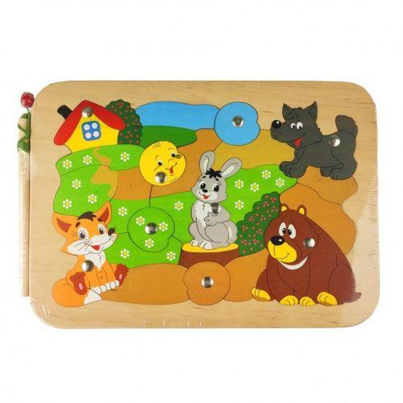 Деревянный эко-пазл "Колобок" будет отличной развивающей игрушкой для маленьких любителей сказок. В комплекте есть палочка с магнитным шариком на веревке, с помощью которого можно вытаскивать элементы пазла. Игрушка выполнена из качественных экологичных материалов, дерево гладкое на ощупь. Размер пазла - 21х30 см.