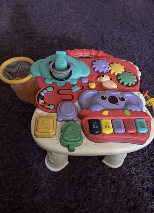 Майже новий ,бо подарували схожий ніжки столика можна дістати ,якщо малюк ще не сидить,всі деталі рухаються, є сортер Можна вішати на кроватку є кріплення , а можна і як столик На столику знімне музичне піаніно( звуки тварин, транспорта,музика) Фігурки які потрібно вставляти Гра з шариками Кільця які потрібно надівати на хобот слонику Та багато різних цікавих штучок)