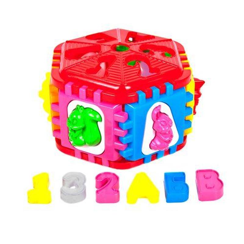 Сортер-шестигранник большой. Сортер - это игрушка, цель которой соотносить фигурки с прорезями. 6 боковых сторон с фигурами разной форму, в которые, в свою очередь, вставляются фигурки животных. Сверху фигурки "А", "В", "С" и "1", "2", "3", снизу геометрические детали.