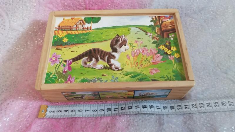 Красочные кубики Bino познакомят малыша с домашними животными. Удобно собирать картинки и хранить кубики в деревянной коробке с крышкой-защелкой. Всего можно сложить четыре картинки. Игра развивает координацию движений, мелкую моторику, внимание, логическое мышление. Набор изготовлен из экологически чистого дерева, окрашенный безопасными яркими и нетоксичными красками. Цена 295грн.стан отличный (к)