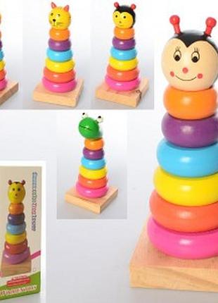 Дерев'яна іграшка Пірамідка MD 2420 тварина, 19см, кільця 6шт, в кір-ці. Розмір - 9-20-9см, Матеріал - дерево. Симпатичні мордочки тварин замість класичної кульки на вершині пірамідки. Дерев'яні кільця різного кольору потрібно нанизувати на штирок із основою. Прим'ята упаковка