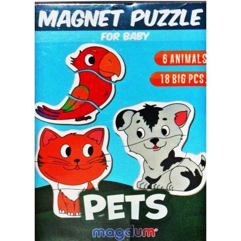 Набір магнітів "Домашні тварини" буде добрим подарунком для дитини. Набір має 18 магнітиків. З них можна скласти зображення 5 домашніх тварин. Магніти зверху ламіновані, під низом якісний картон та сам магніт. Допоможе розвивати логічне мислення.