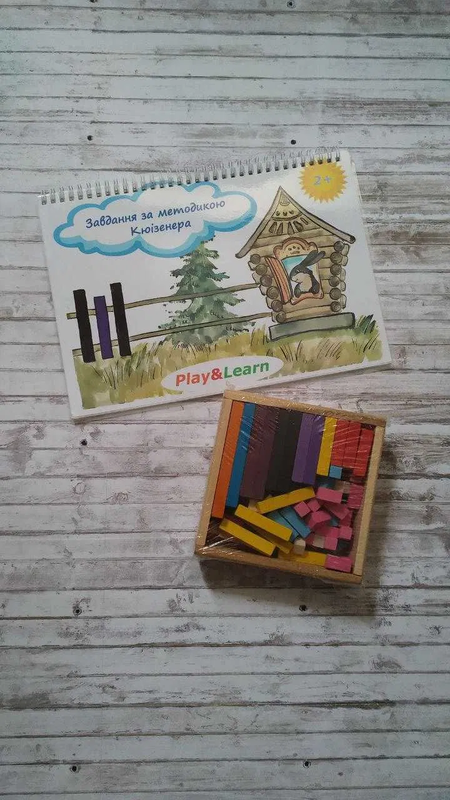 В набор входит: - 116 палочек Кьюизенера - Тетрадь с заданиями в формате А4. Палички К'юїзенера. Состоят из 116 деревянных призм, окрашенных в 10 разных цветов. Каждый элемент обработан и окрашен сертифицированной безопасной для детского здоровья краской. Детали отличаются формой и размерами. Например, у мельчайшего элемента – кубика – длина ребра составляет 10 мм. Подбор палочек проводится хитрым образом: из них можно сводить стены, домики и другие конструкции, путем сочетания различных цветов или пытаясь сконструировать фигуру из одноцветных элементов. Цвета и размеры палочек Кьюизенера позволяют заниматься моделированием и при этом невольно запоминать числа, осваивая смысл количества и сочетаний. В процессе игры с этими элементами появляется понимание кратности, ширины, длины и количества. Дети играют, строят и складывают палочки, невольно развивающие в них абстрактное мышление.