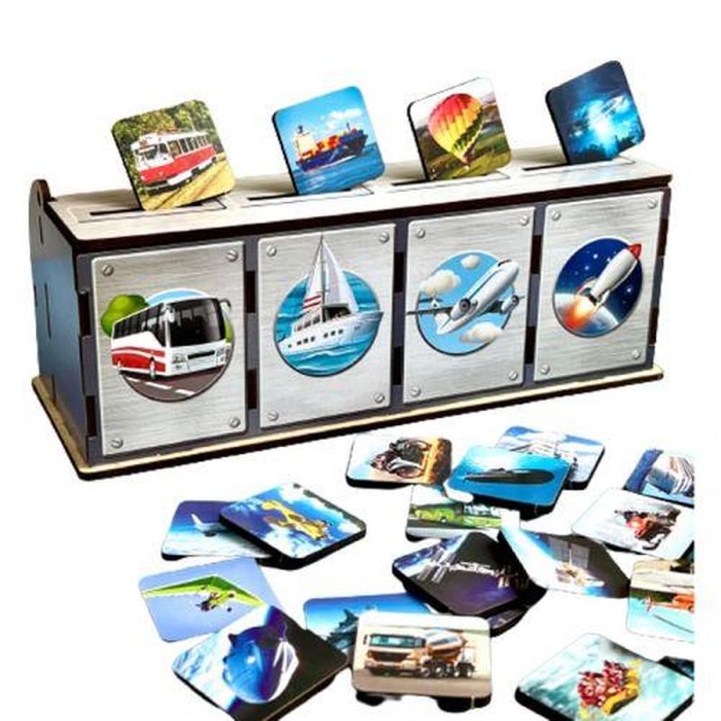 4 тематических ящика с различными видами транспорта: водный, наземный, воздушный и космический. В наборе имеется 40 плашек с реалистичными сортировочными рисунками. Ребенку нужно разложить весь транспорт по ассоциациям: автобус – это наземный вид транспорта, а корабль – водный. Второй вариант игры: выкладывайте по 3 плашки, например, с воздушным транспортом, а 4-й с поездом и попросите ребенка и попросите ребенка найти лишнюю плашку. Бренд: Ubumblebees Язык: Украинский Упаковка: Пленка Цвет: Разноцвет Вес в упаковке: 450 г Габариты в упаковке: 9 x 8 x 23 см Габариты без упаковки: 10 x 8 x 23 см Cтрана производитель: Украина Материал: Дерево Комплектация: 4 ящичка, 40 плашек