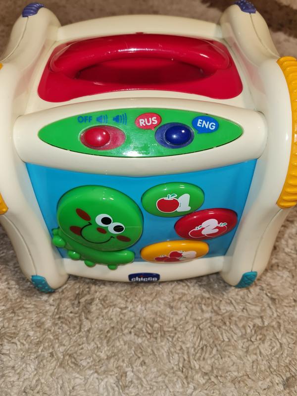 Игрушка Говорящий Куб Chicco двуязычная (английский/русский). Простого движения достаточно для того, чтобы открыть новый мир песен и дружественных голосов на другом языке. Очень простой и веселый способ начать знакомство с иностранным языком. Каждая сторона Говорящего Куба Chicco включает в себя различные игровые функции, которые помогают малышу развивать координацию. Игрушка Говорящий Куб имеет практичную ручку для переноски. Ребенок слушает мелодии, которые поет гусеничка и симпатичный цветочек и сам пытается повторить их на свой манер. Ребенок исследует каждую сторону Говорящего Куба и открывает для себя цифры, буквы алфавита, учится различать формы и цвета на двух языках. Состояние на фото (есть несколько потертостей),работает отлично.