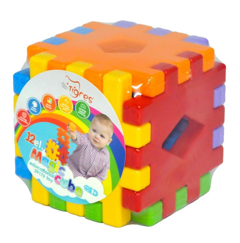 Развивающая игрушка "Волшебный куб" 12 элементов - яркий, увлекательный и очень полезный подарок для ребенка, который сочетает в себе функции конструктора и сортера. Чтобы сложить куб, ребенку нужно соединить его стенки, которые представляют собой 6 разноцветных элементов. Из элементов куба можно также составлять другие конструкции. Создание конструкций очень полезно для развития творческого потенциала ребенка. Элементы гладкие и выпуклые со всех сторон, что очень удобно для маленьких ручек. Кроме того, в каждой стенке куба есть фигурное отверстие, к которому нужно подобрать фигурку соответствующей формы и протолкнуть ее внутрь куба. 6 разноцветных фигурок различной формы идут в комплекте. Подбирая фигурки под отверстия, ребенок изучает формы и цвета, учится сравнивать и анализировать, развивает память и логику, глазомер, ловкость, мелкую моторику и координацию движений. Также вы можете купить игрушки оптом. Упаковка - полиэтилен.