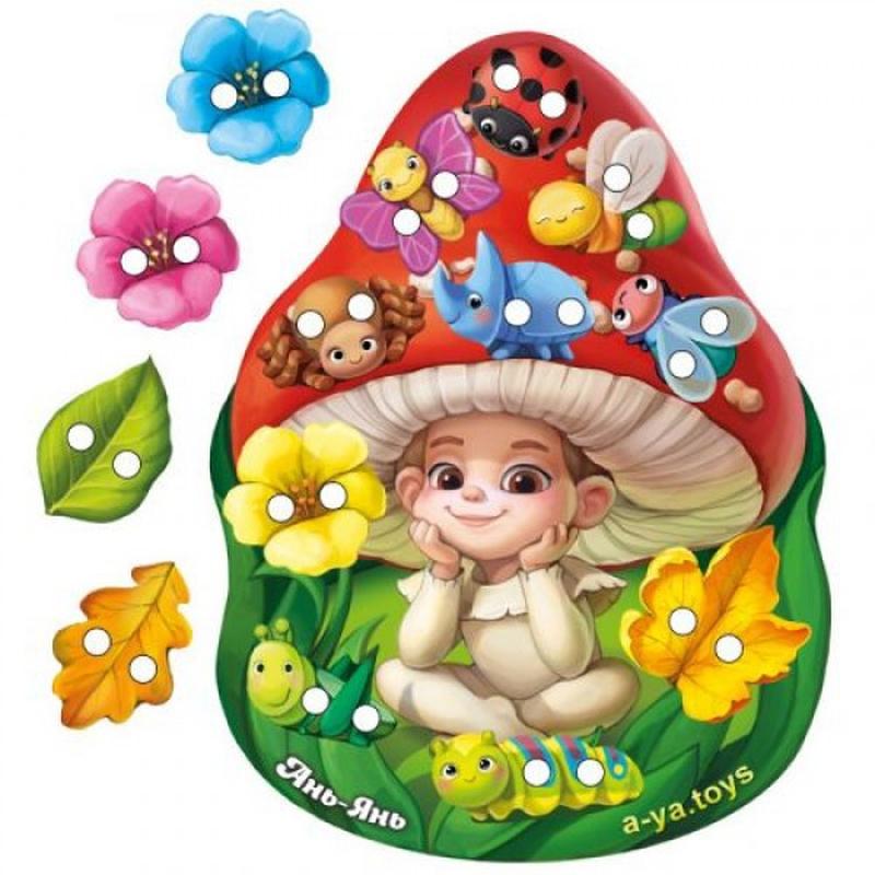 Розвивальна іграшка з натурального дерева. Шнурівки розвивають дрібну моторику рук, формують навички шнурування, зав'язування шнурка в бант, просторове орієнтування, координацію. Розмір іграшки 25х18,5 см. У комплекті є основа у формі милого грибочка, шнурок і 10 деталей для шнурівки._