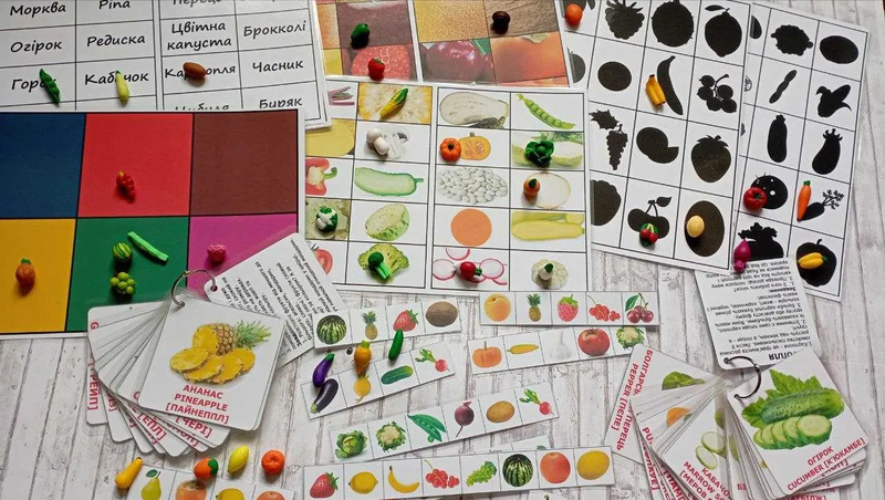 Набор для изучения овощей: - 20 фигурок (2-3 см) - 20 двусторонних карточек на кольце (с фактами и заданиями; карточки содержат защитные поля ламинации) - 6 задач с последовательностью разного уровня сложности - Сортировка по цветам - Сортировка по первой букве - Соотношение по названию - Соотношение по серединке (фрукты/ягоды в разрезе) - Соотношение по кожице Набор для изучения фруктов: - 16 фигурок (2-3 см) - 16 двусторонних карточек на кольце (с фактами и заданиями; карточки содержат защитные поля ламинации)) - 6 задач с последовательностью разного уровня сложности - Сортировка по цветам - Сортировка по первой букве - Соотношение по названию - Соотношение по серединке (фрукты/ягоды в разрезе) - Соотношение по кожице
