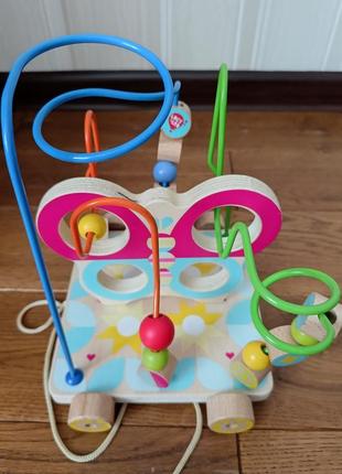 Дерев'яна іграшка-каталка у вигляді метелика, екологічно чиста та безпечна для дітей. Всі деталі такої іграшки дуже добре прикріплені, дитина не зможе щось зламати або відірвати. Метелик стоїть на дерев'яній підставці з коліщатками. Така іграшка дуже корисна для координації руху, так, як її можна штовхати, катати, тягнути за собою. Малюкам дуже подобається процес переміщення деталей з однієї частини в іншу, і такий, здавалося б, простий процес допомагає дитині розвивати гнучкість ручок і навчитися точної та точкової дії та рухів. На додаток до тренування моторики фігурки на лабіринті ще можна використовувати для того, щоб вивчити основні кольори, напрямки руху. Стан ідеальний.