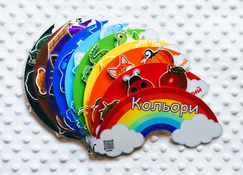 Начни изучение цветов интересно с нашей радугой "Цвета" - 10 цветных фигур-основ в виде радуги - 30 деталей на липучках - качественная фотопечать - пакетная ламинация - крепление - кольцо
