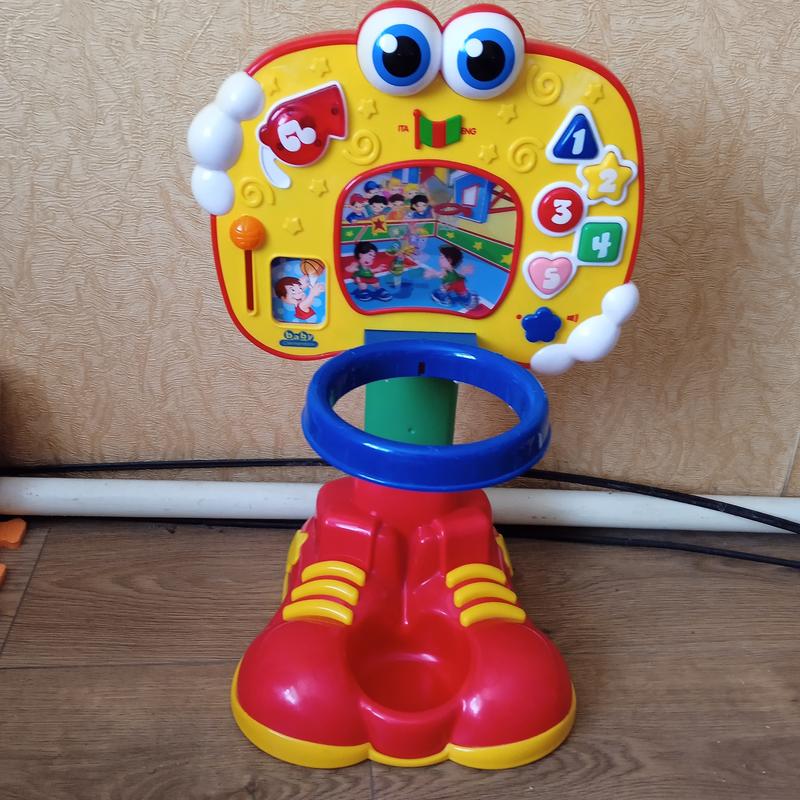 Игра от 1 года,Баскетболь. Световое и музыкальное сопровождение. Состояние красивое, полностью рабочее, высота кольца имеет 2 позиции. Высота самой игрушки 50 см. Каждый гол сопровождается музыкальными и световыми эффектами, сенсорный датчик распознает прохождение любого мяча, или другого предмета.