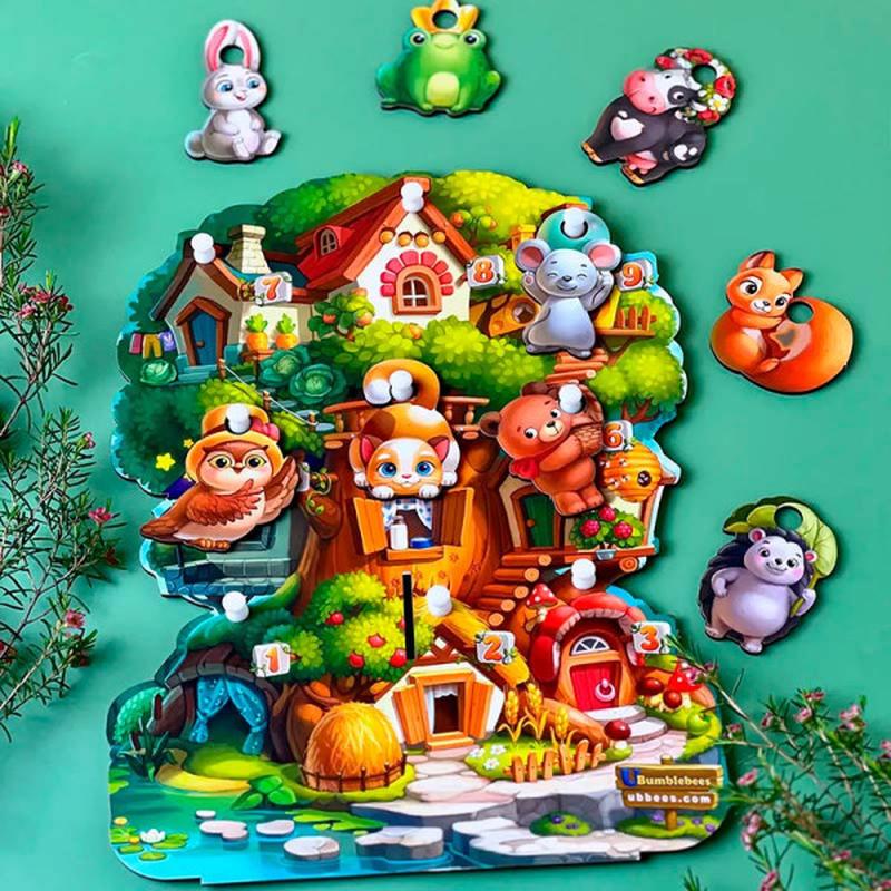 Дерево з підставкою. У кожної плашки з твариною (9 тварин) є дірочка, щоб прикріпити його до будиночка. Відпрацювання прийменників: запропонуйте дитині посадити зайчика праворуч від білки і зліва від сови (так, тварини ходять в гості). Точно також "зверху і знизу", "хто де живе?".
