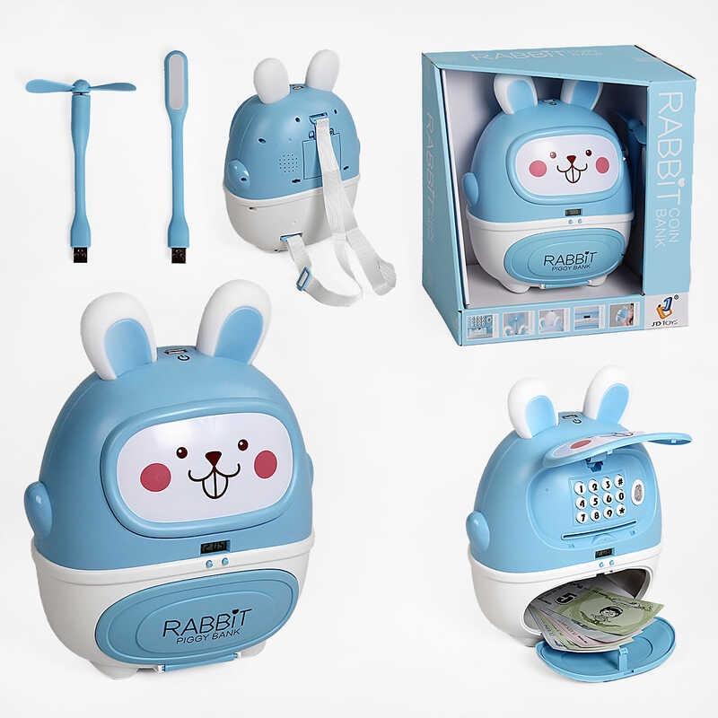 Бажаєте навчити вашу дитину відповідально користуватися кишеньковими грошима? Тоді цей милий кролик-сейф стане чудовим помічником для дитини на шляху фінансової грамотності! Іграшка багатофункціональна і може використовуватися як стаціонарна скарбничка, і як яскравий рюкзачок, а також у комплекті з нею йде лампа і вентилятор, що тільки розширює функціонал іграшки. Кролик закривається на кодовий замок та має кілька іграшкових банкнот для гри. Разом з цією іграшкою ваш малюк розвине свої когнітивні та творчі здібності, почне більш відповідально ставитися до грошей та отримає у свою колекцію яскравий та функціональний аксесуар. Особливості: - Розміри іграшки: 18х12х25 см; - іграшка виконана у вигляді кумедного кролика; - у комплекті із сейфом йдуть вентилятор та лампа, які підключаються до іграшки за допомогою usb-порту; - іграшка підсвічується та програє мелодії та пісеньки зі словами англійською мовою; - сейф також озвучує кожну свою дію короткою фразою англійською мовою; - підсвічування та звуки працюють від трьох батарейок типу "АА" (не включені в набір); - сейф має годинник, який працює від окремих батарейок, які вже включені в набір; - Дефолтним кодом для відкриття сейфа є 0000; - іграшка симулює звуки сканування відбитка пальця під час відкриття сейфа; - сейф трансформується в рюкзачок і до нього кріпляться лямки; - Довжина лямок регулюється для комфорту дитини; - іграшка виконана з міцного та легкого пластику з м'якими гумовими вушками. * Характеристики та комплектація товару можуть змінюватися виробником без попередження