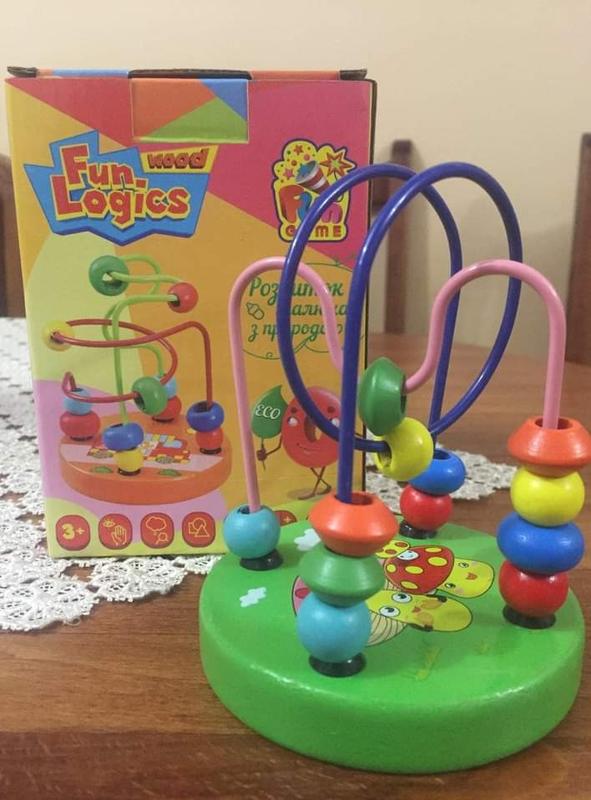 Пальчиковий лабіринт-розвиваюча гра для найменших. Гра являє собою дерев'яну підставку, на якій закріплені вигнуті металеві дроти з намистинками та предметами різних кольорів та розмірів. Граючи, малюк розвиватиме свої тактильні відчуття, тренуватиме логічне та просторове мислення, дрібну моторику рук. Деталі іграшки виготовлені з якісної деревини, пофарбовані в яскраві кольори та приємні на дотик. Розміри/габарити - Довжина (см): 9 см - Ширина (см): 9 см - Висота (см): 12 см Розмір упаковки: 9.5 см 9.5 см 13.5 см.