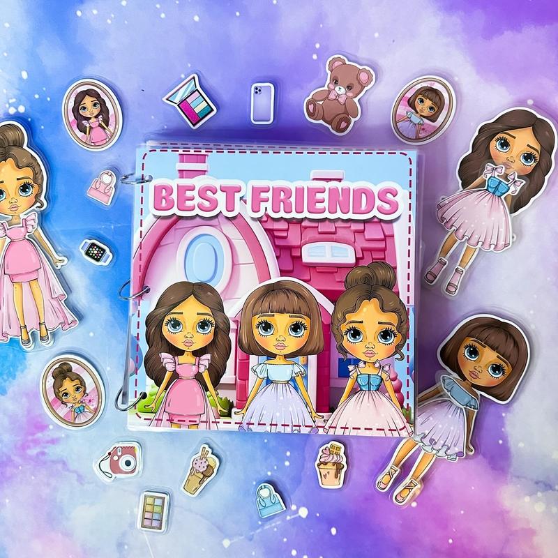Альбом на липучках Best friends Размер 21х21 см 3 куклы персонажи 10 страниц (8 игровых) Домик в розовых тонах, в котором вы можете: Выбрать наряды для каждой куколки Принять ванну и выполнить уход за кожей Поладить вкусностями на кухне Выпить чай в гостиной Поставить Тик-токи в кабинете