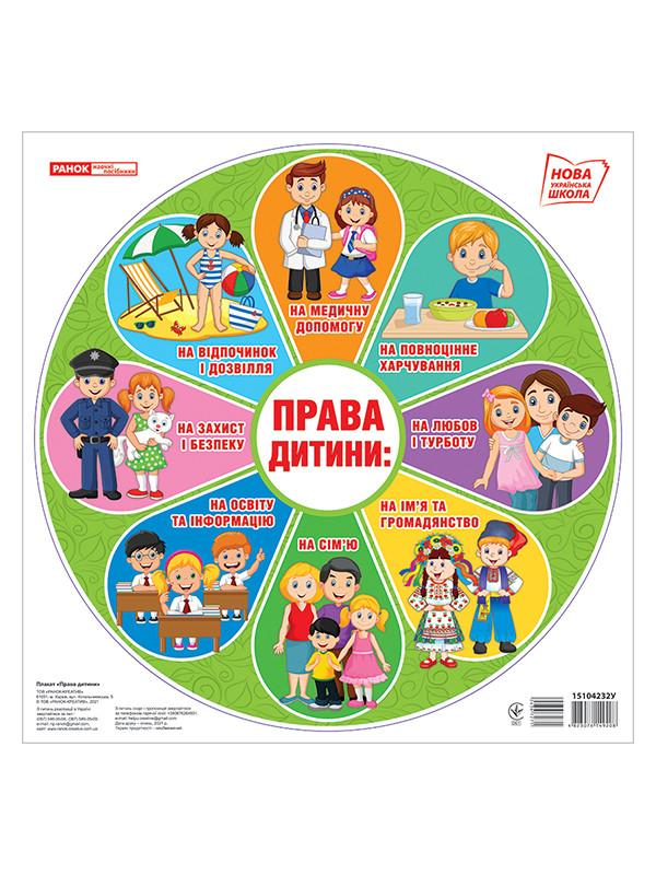 Формат:48х58см.Яскравий плакат для оформлення інтер’єру класу для ознайомлення дітей зі своїми правами.Містить корисні розділи із Закону України про «Права дитини».Оформлений у стилі НУШ,має вигляд квітки з різнокольоровими пелюстками,їх 8.На кожній прописані права дітей, що допомагає учням краще їх запам’ятати.