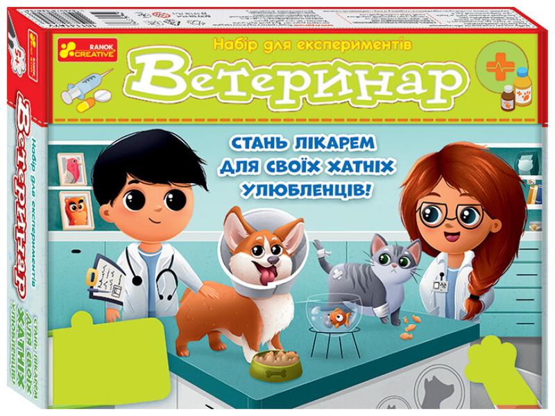 Новинка-сенсація від Ранок-Креатив, на яку так давно чекали юні ветеринари і маленькі захисники тваринок! В цьому науковому наборі - ціла зооветеринарна клініка -- ВІДКРИВАЙ І ГРАЙ! Що і як робити - детально описано в кольоровій інструкції. Від прийому у ветеринара до лікування тваринки. Якісна комплектація набору принесе лише задоволення від ігрового процесу. Яскраве упакування і тематичний дизайн гарантовано сподобаються дітям. Набір для експериментів «Ветеринар» - це поєднання цікавого і корисного. • Ідеальне рішення для подарунка дітям, які мають домашнього улюбленця чи які б дуже хотіли його мати; • Рекомендуємо набір для дітей віком від 5 років. Мрієш про домашнього улюбленця або вже маєш? Тоді тобі просто необхідно навчитися піклуватися про нього. Що робити, коли він прихворів? До кого звертатися? Як допомогти улюбленцю, якщо він пошкодив лапку? Не хвилюйся! Разом із набором «Ветеринар» ти станеш справжнім рятувальником для тваринок! Набір містить: посвідчення ветеринара, захисну маску, захисні рукавички, стетоскоп, ветеринарну картку пацієнта, пробірку для забору крові, мірний стаканчик, червоний харчовий барвник, 2 шприци, пластикову трубочку (катетер), піпетку Пастера, картонний термометр, рентгенівський знімок, заготовку картонної лапи, шерстяну нитку, пластикову трубочку, бинт, ветеринарний комір, скотч, інструкцію.