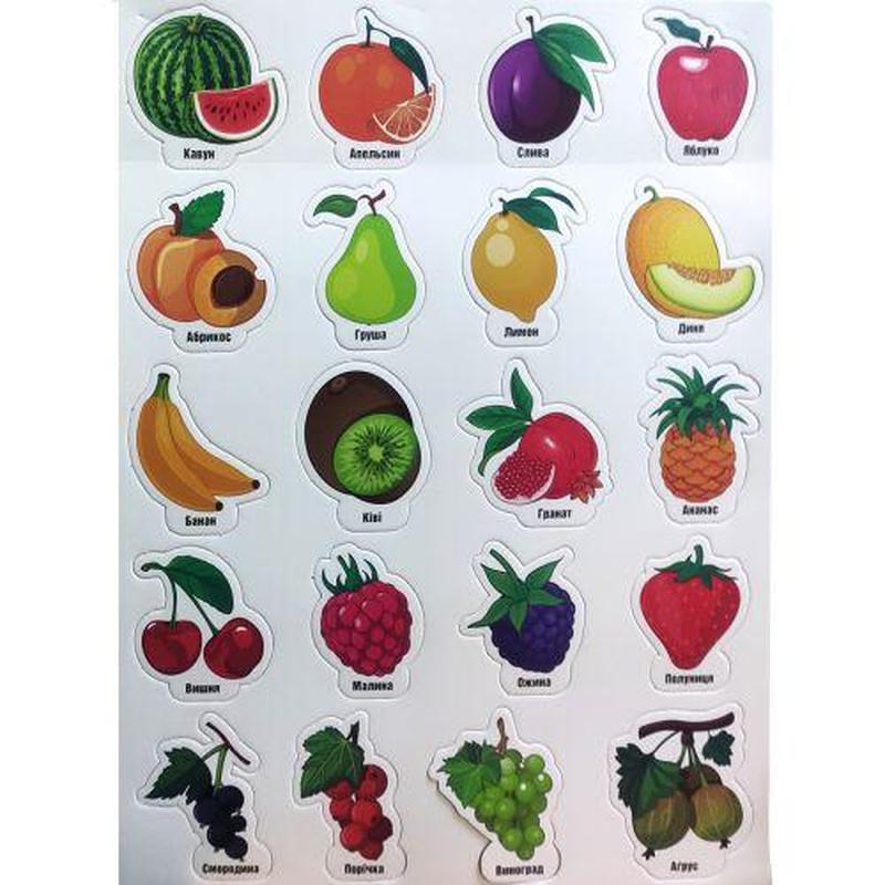 Набір з 20 магнітів з фруктами та ягодами на листі розміром 39х30 см. Кожен продукт підписаний українською мовою. Граючи з такими магнітами дитина зможе весело та легко вивчити назви продуктів харчування. Виконані з якісного та безпечного матеріалу. Для дітей віком від 3-х років.