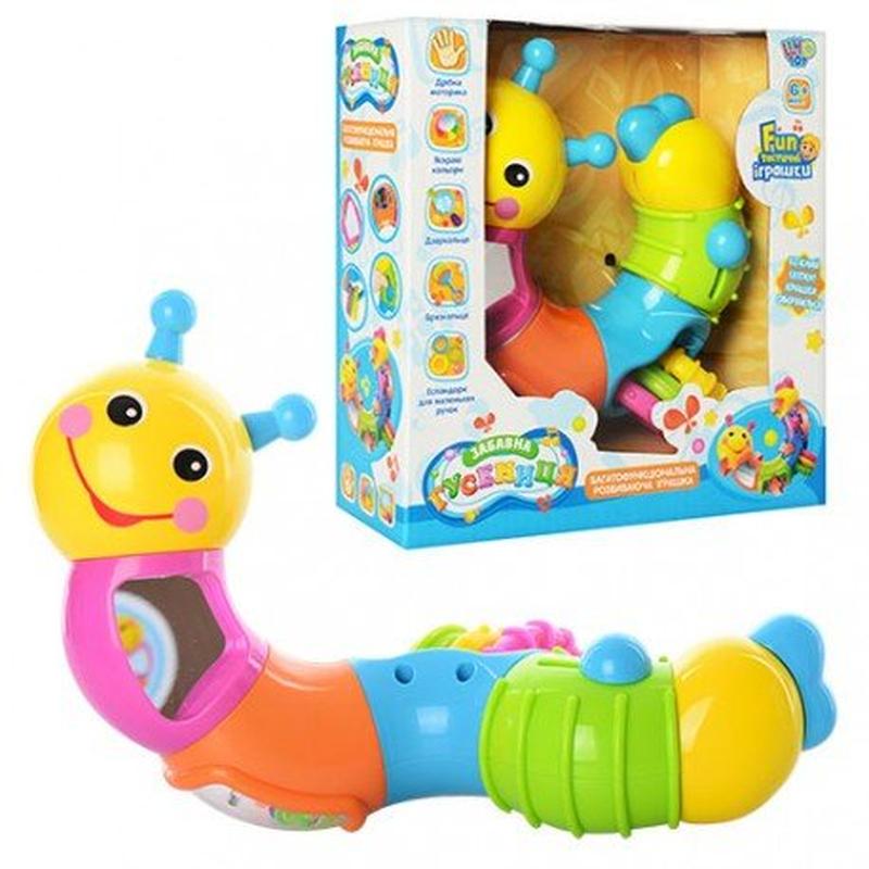 Забавная гусеница с веселой мордашкой состоит из шести вращающихся независимо друг от друга секций. На одной из секций расположен переключатель, на другой – три мягких эластичных эспандера. Если игрушку потрусить, она загремит как погремушка. Щелкая переключателем, вращая секции гусеницы и играя эспандерами, ребеночка учится координировать свои движения. Совершенствуется мелкая моторика, ручки становятся сильнее. Кроме того, развиваются зрительная память и слух. Для того чтобы малыш учился узнавать себя, на гусенице есть зеркало. Для деток от 0 до трех лет. В коробке 18-18-6 см.