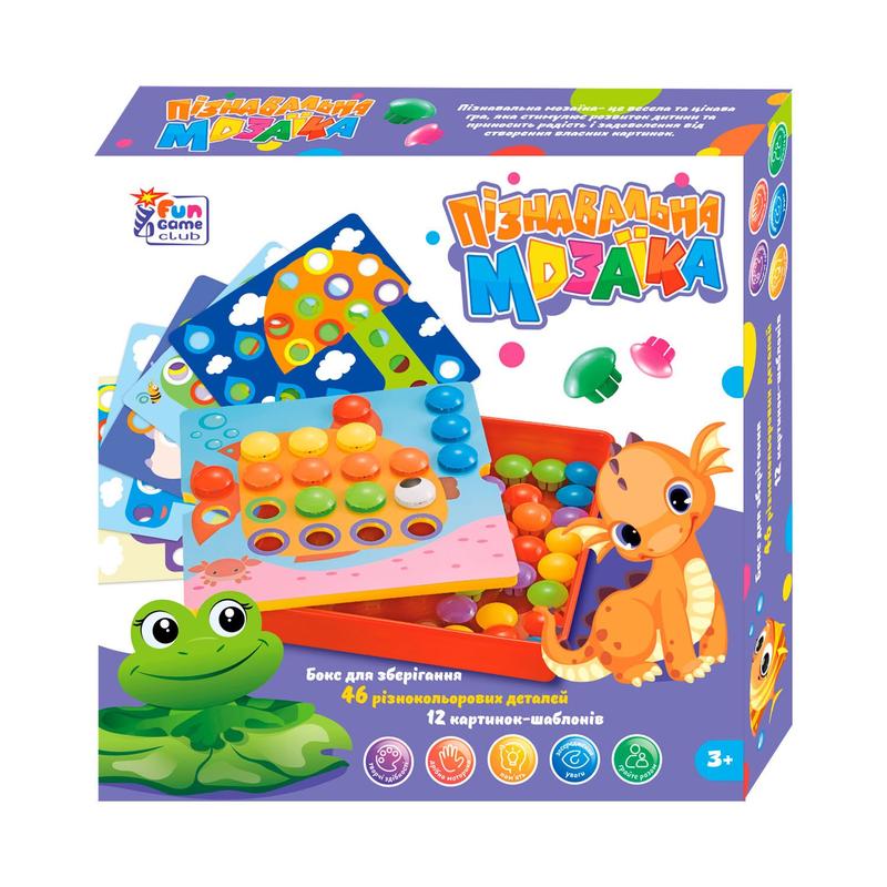 “Посновочная мозаика” от “4FUN Game Club” - это настоящий праздник цвета и ярких красок! В наборе представлено все необходимое для создания великолепных мозаик: 46 цветных фишек и 12 ярких шаблонов с рисунками. Дети могут располагать шаблоны по своему желанию и приступать к сборке мозаики. В набор также входит удобный и вместительный кейс, в котором можно компактно хранить шаблоны и детали мозаики. Главная цель игры состоит в том, чтобы вложить разноцветные фишки грибовидной формы в отверстия подходящего цвета на шаблонах. Эта игра способствует развитию мелкой моторики рук, обучает детей различать цвета и тренирует их творческие навыки, воображение и фантазию. Особенности: - размер игровой платформы: 25х25 см; - 46 больших разноцветных деталей; - 12 картинок-шаблонов с красочными изображениями; - качественная насыщенная печать; - съемная крышка с отверстиями для мозаики; - удобное углубление для хранения игровых элементов. * Характеристики и комплектация товара могут меняться производителем без уведомления