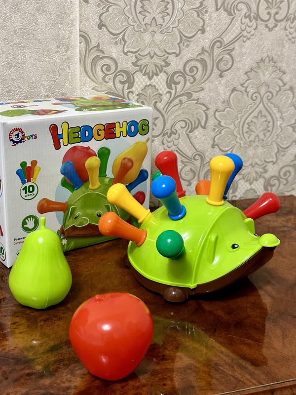 Игрушка детская Ежик - развивающий сортер, упаковка - коробка. На спине ежика есть 10 отверстий, в которые необходимо вставить разноцветные "голки". Также в комплекте яблоко и груша. Игрушка оснащена 4-мя колесами, на носу есть отверстие для веревки (можно использовать как каталку). Игрушка выполнена из высококачественного пластика, не содержит вредных веществ. Размер упаковки 19-10,5-15 см
