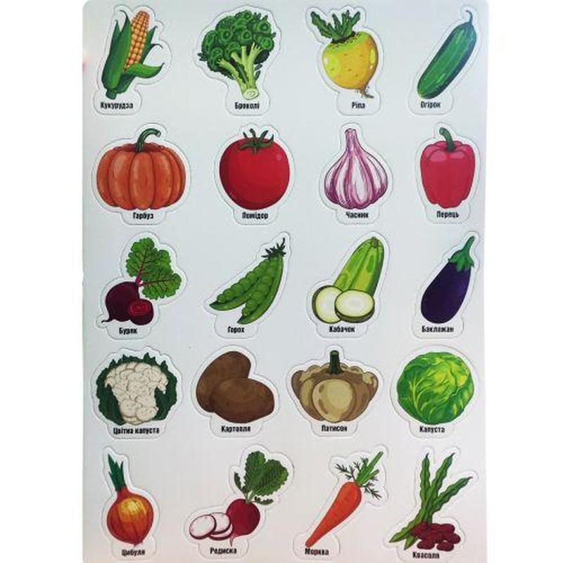 Набір з 20 магнітів з овочами на листі розміром 39х30 см. Кожен овоч підписаний українською мовою. Граючи з такими магнітами дитина зможе весело та легко вивчити назви продуктів харчування. Виконані з якісного та безпечного матеріалу. Для дітей віком від 3-х років. Мова: Українська Паковання: Пакет Колір: Різнобарв'я Вага з упаковкою: 230 г Габарити в упаковці: 0.2 x 46.5 x 30 см Габариті без паковання: 0.2 x 39 x 30 см Країна виробник: Україна Матеріал: Комбінований Комплектація: 20 магнітів